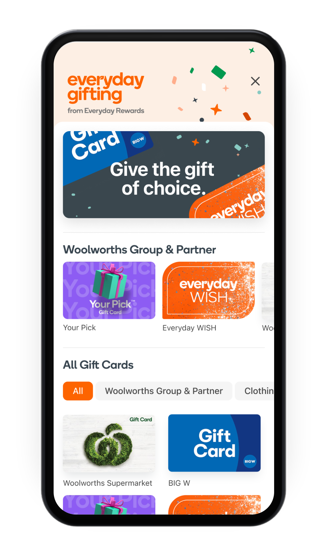 Use your Everyday Pay wallet to shop for Gift Cards in the Everyday Rewards app. Simply store your Gift Cards^ in your wallet to easily redeem in-store.